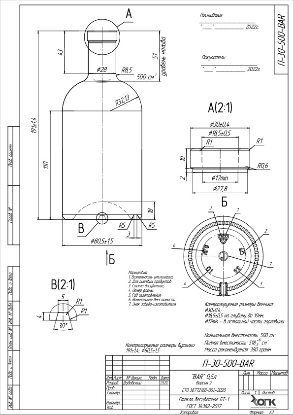 Стеклянная бутылка П-30-500-BAR — это универсальная тара объёмом 500 мл, предназначенная для розлива алкогольных напитков, настоек, ликёров, сиропов и другой жидкой продукции. Бутылка выполнена из прочного пищевого стекла, устойчивого к ударам и перепадам температур, что обеспечивает надёжность при транспортировке и хранении.